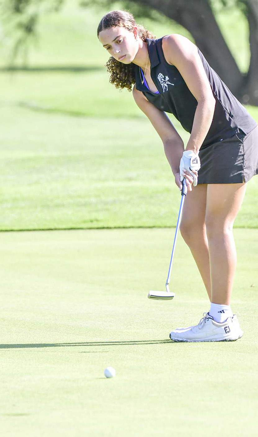 Sophomore Isabella Trejo focuses in on this putt during Sutton’s lone home event of the 2025 season. Trejo finished the nine-hole quad with a 45, Sept. 25. TORY DUNCAN | CLAY COUNTY NEWS