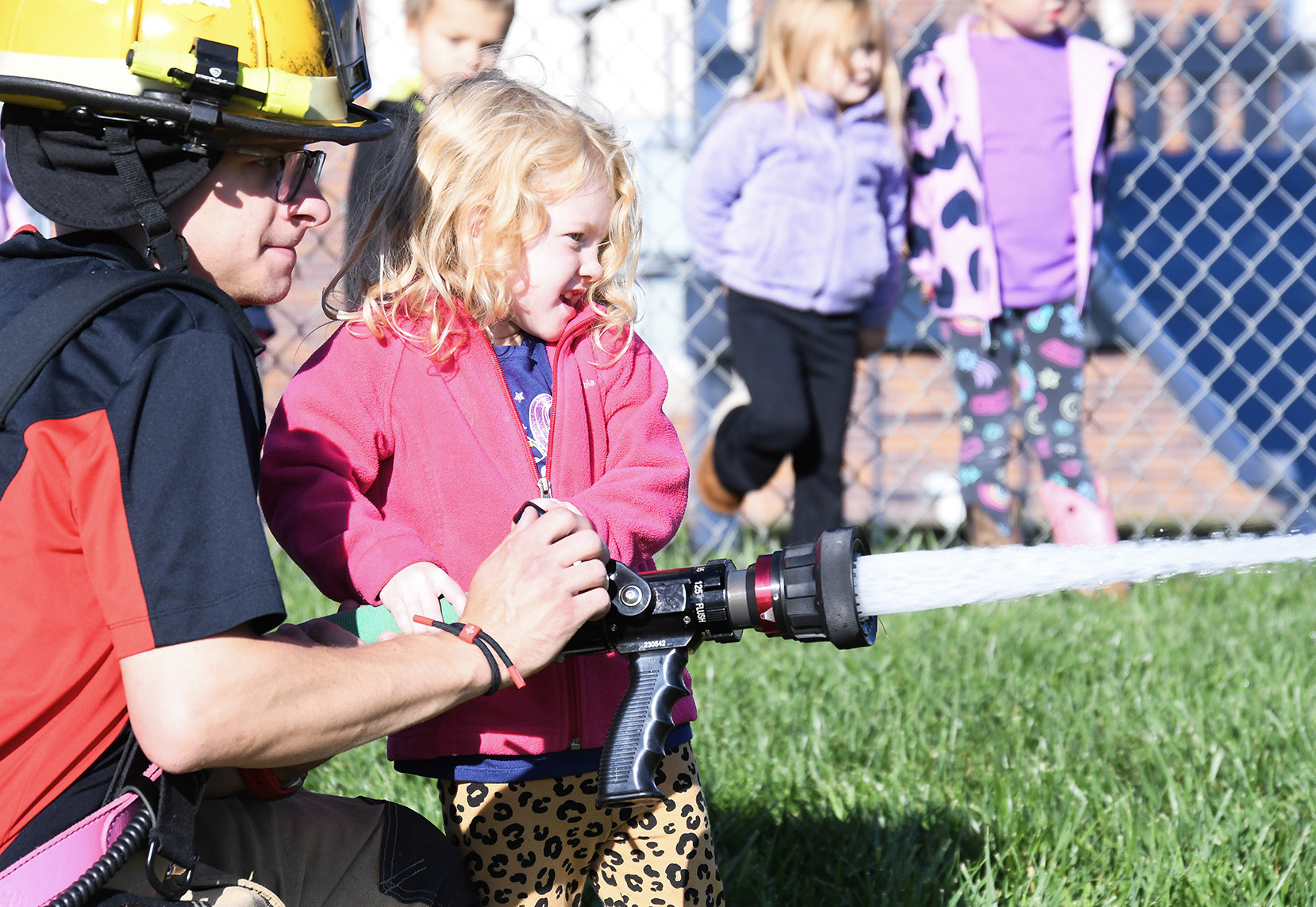 County fire departments hosted fire safety days for students at Harvard, Sandy Creek, and Sutton schools Oct. 7, 8 & 10. At the left, Harvard students look at the gear a firefighter wears when going to a fire. In the center, Adam Ochsner helps a Sandy Creek preschooler knock down a cone using a hose. At the right, Sutton students watch as a water-based smoke fills the room, giving them an idea of what would happen if their house was on fire. Students were then shown how to properly exit the area.