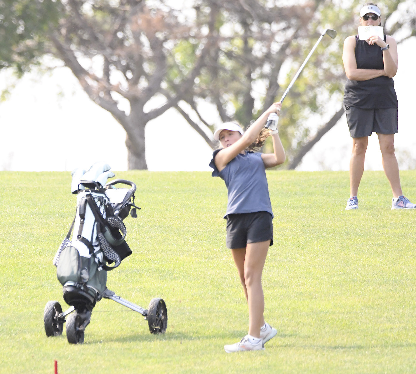 Mia Ochsner’s first-ever tournament came in Grand Island in early September, 2022. Here, Ochsner plays a shot from the fairway early in 2022 at the Galaway Creek golf course in Henderson with her mother, Sara, in the background. In four years, Ochsner’s first-ever tournament score of 143 in Grand Island would see the now-senior set her personal best score of 80, on this very course in early September 2025. CCN FILE PHOTO FROM 2022 SEASON | CLAY COUNTY NEWS