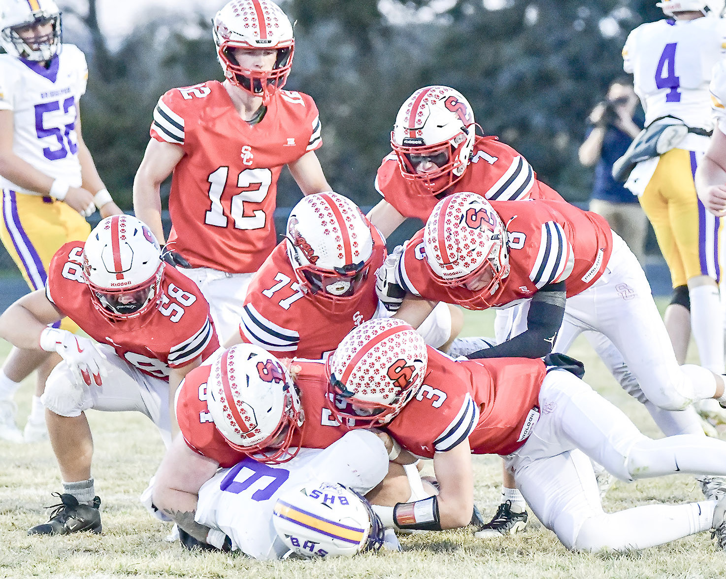 Gang tackling is a Cougar specialty, and has been all season. Here, Bridgeport’s James Jeffords is taken down by six Cougars, including Jackson Gerdes (58), Jonas Amos (54), Kamerin Sealey (3), Sam Watts (77), and Alston Clark (7), while Wes Biltoft (12) looks on during the play. TORY DUNCAN | CLAY COUNTY NEWS