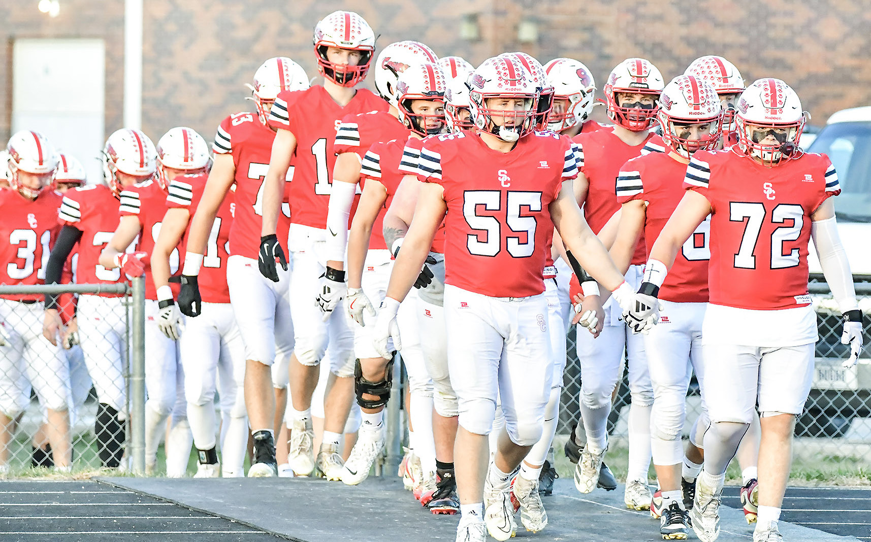 Sandy Creek’s squad enters their home turf prior to kickoff of their quarterfinal game with the Bridgeport Bulldogs. The Cougars improved to 10-1 with a 45-6 win and advanced to their third straight D-1 semifinal game this Friday against Plainview. Kickoff this Friday is set for 6 p.m. on “The Hill.” TORY DUNCAN | CLAY COUNTY NEWS