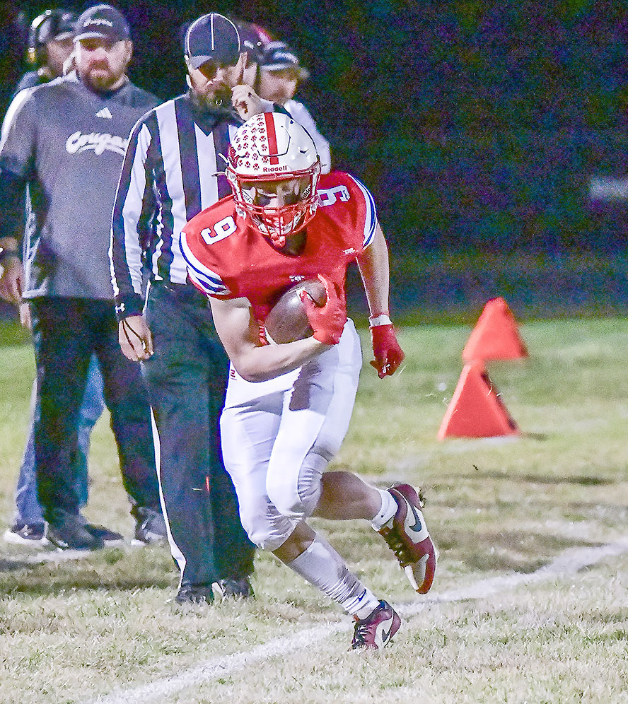 Junior Logan Tomky hauls in one of his two catches during Sandy Creek’s 39-point win over Bridgeport. He had a total of 19 yards through the air. TORY DUNCAN | CLAY COUNTY NEWS