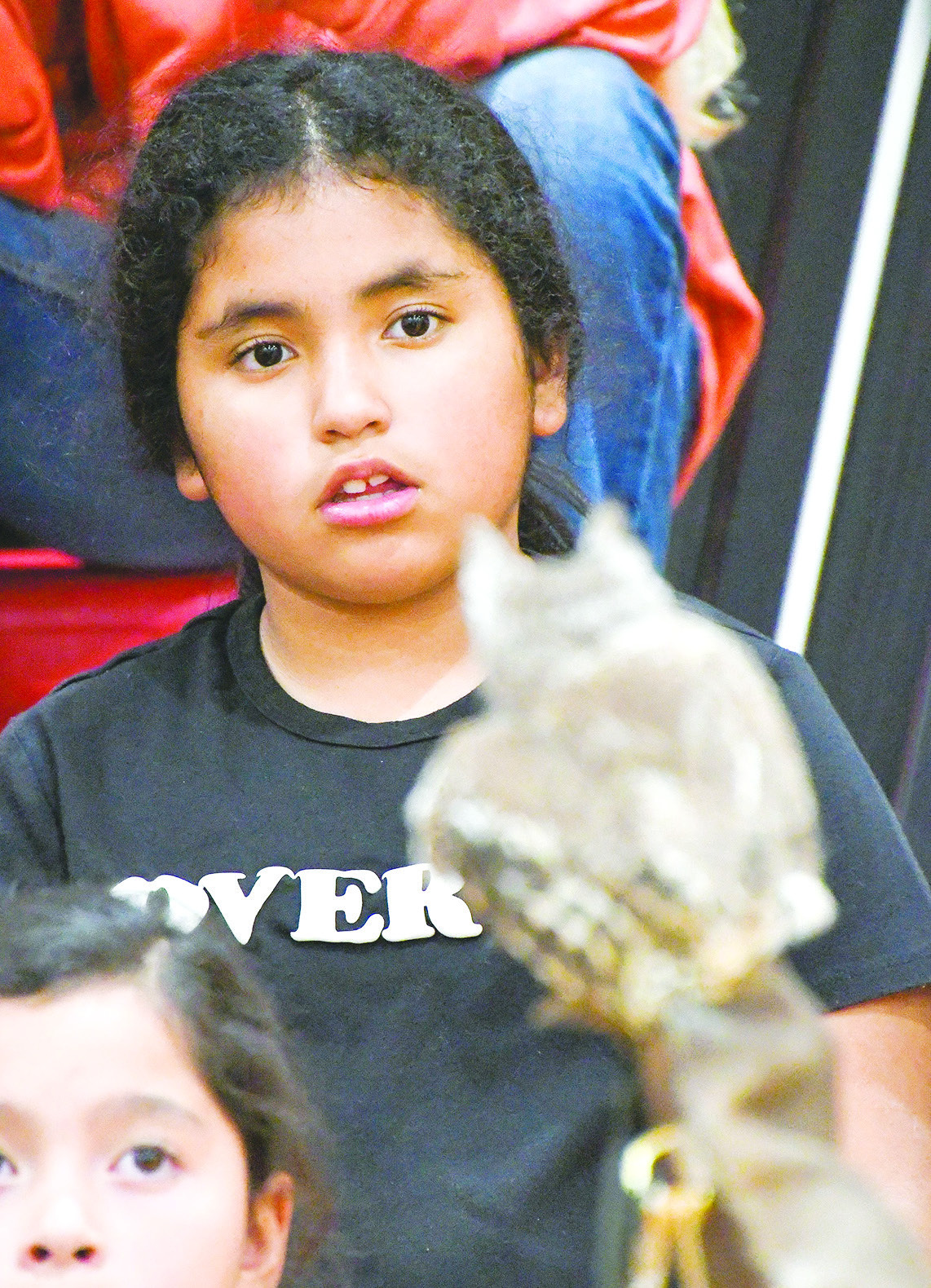 Following morning events with various activities, sponsored by the Edgerton Explorit Center in Aurora, Sutton Elementary students gathered for three afternoon sessions, covering different topics. Above, kindergarten-second grade students react to a balloon being filled with dry ice. At the right, during the Raptorology session, Yohanny Acosta Mendoza listens closely as information is shared about an owl. ASHLEY D SWANSON | CLAY COUNTY NEWS