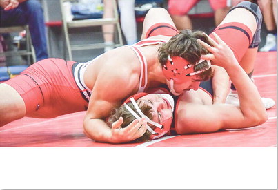 Like Poppe, Hinrichs pinned his way to the 150-pound title, opening with a 2:47 pin over Matthew Collette of Republic County, then a 1:11 technical pinfall win over Jonathan Carpender of St. Cecilia.
