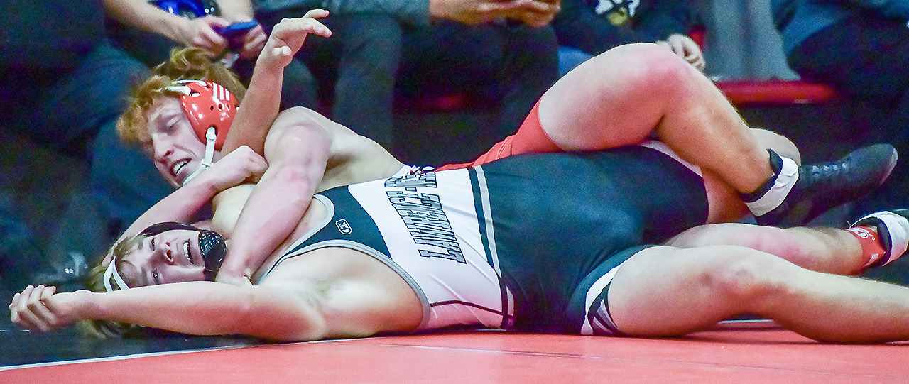 Junior Brody Schelkopf works towards a pinfall win over Lawrence-Nelson’s Grayhm Beck, a match that Schelkopf won in 2:24, placing Schelkopf fourth overall in the 175-pound weight class. TORY DUNCAN | CLAY COUNTY NEWS