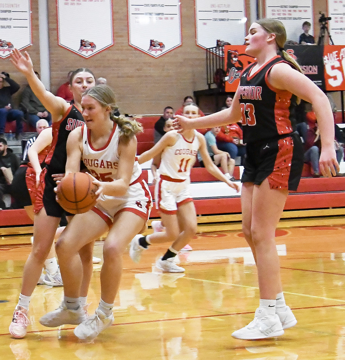 Strong defense like this from Jade VonSpreckelsen has driven the Sandy Creek girls record to 13-2 on the year, as the Cougars rolled past both Superior and Red Cloud late last week. In the background for the Cougars is Caitlyn Biltoft (11). LILY GRIESS | CLAY COUNTY NEWS