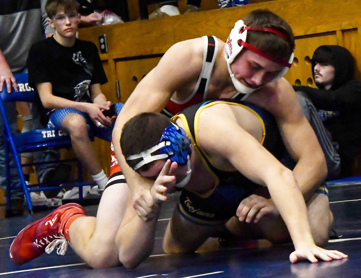 Sandy Creek junior Jackson Gerdes controls Tri County’s Justin Schwisow in the consolation semifinal round at the 2026 SNC meet. Gerdes gained an eventual 2:37 pinfall win over Schwisow and finished fourth overall in the 175-pound weight class. LILY GRIESS | CLAY COUNTY NEWS