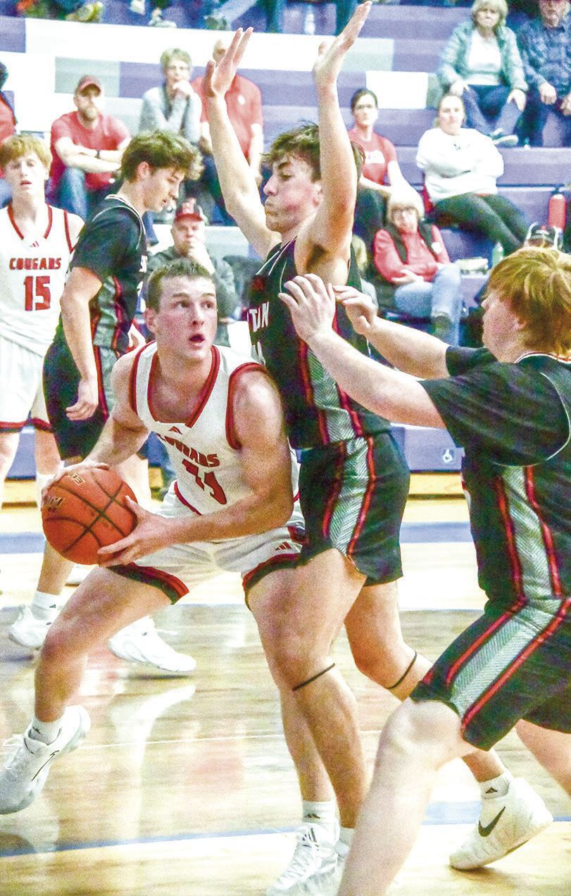 Sandy Creek junior Wes Biltoft looks to score against Sutton defenders Mason Ehly and Cash Parrish during the Cougars’ eightpoint win in the Southern Nebraska Conference semifinal game Thursday, Feb. 5 at Centennial High School. TORY DUNCAN | CLAY COUNTY NEWS