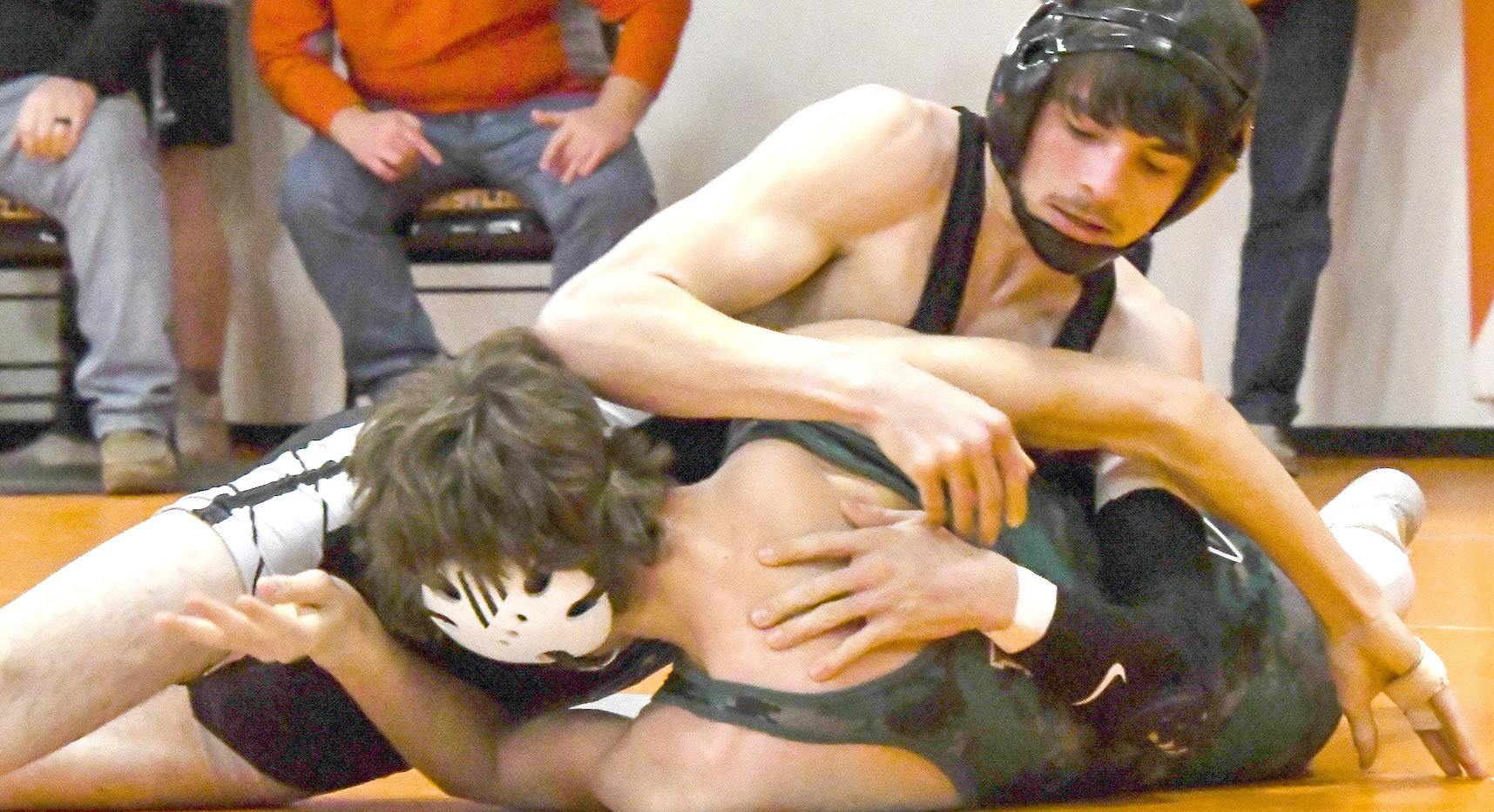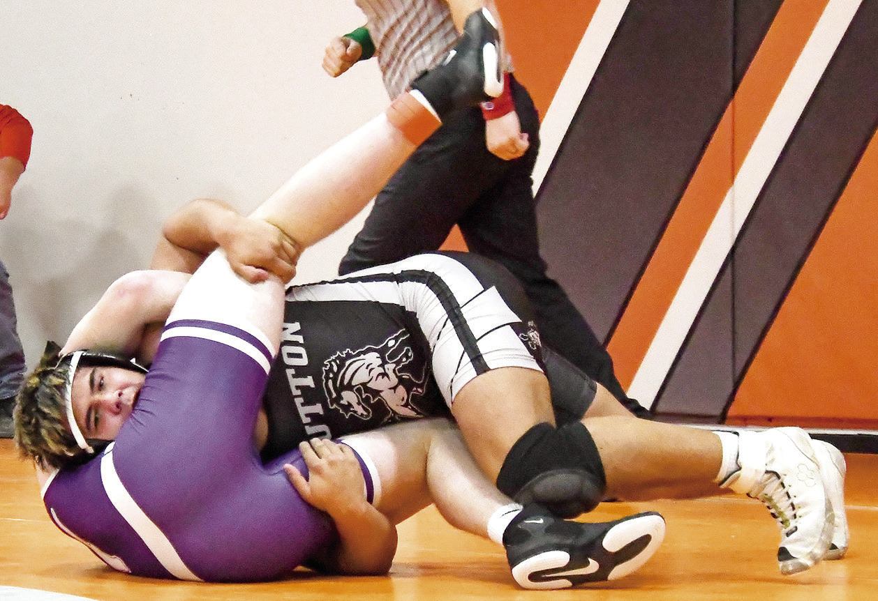 Aydin Banta works towards a 4:38 pinfall win over Burwell’s Owen Stevensen in the openingand will make his first trip to Omaha for the state wrestling meet this week. round of the 215-pound D-1 District bracket at Oakland. Banta placed second overall