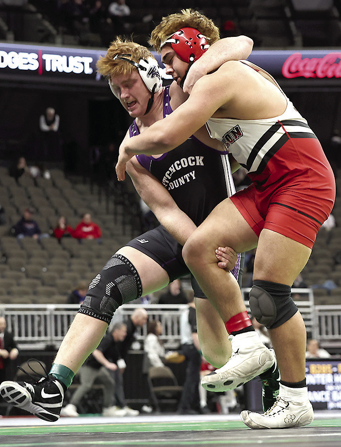Sutton junior Aydin Banta placed sixth in the Class D 215-pound weight class, as he claimed three wins in six matches in Omaha. Here, Banta battles with Karson Shuler of Hitchcock County in the fifth and sixth place match Saturday, Feb. 21. COURTESY PHOTO BY JEROMY VAUBLE | CLAY COUNTY NEWS