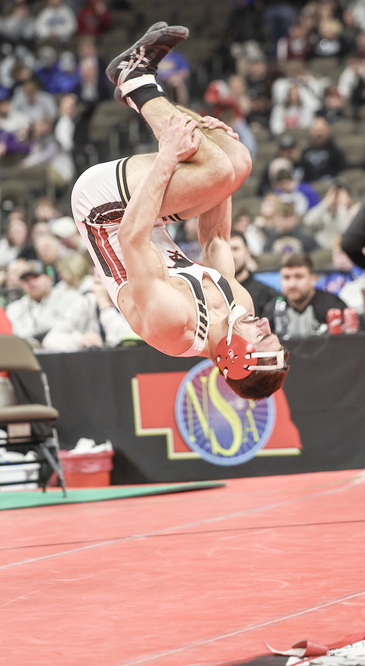 Griffin Bergen does a full flip on the mats after winning the Class D 175-pound state championship Saturday afternoon. COURTESY PHOTO BY JEROMY VAUBLE | CLAY COUNTY NEWS