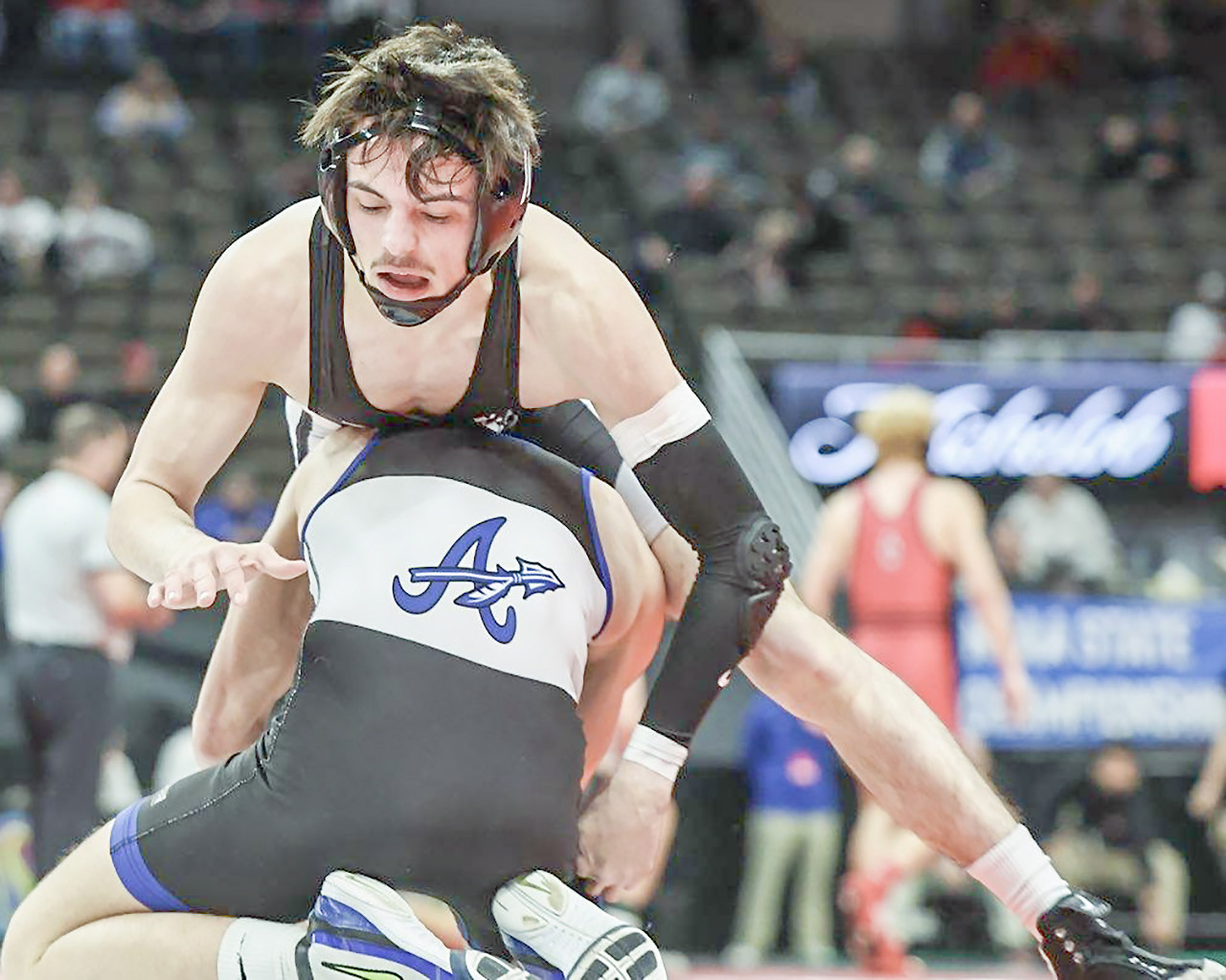 In the final match of Banta’s medal run at state, Karson Shuler of Hitchcock County claimed a 1:53 pinfall win over Banta to place the Mustang junior sixth overall.