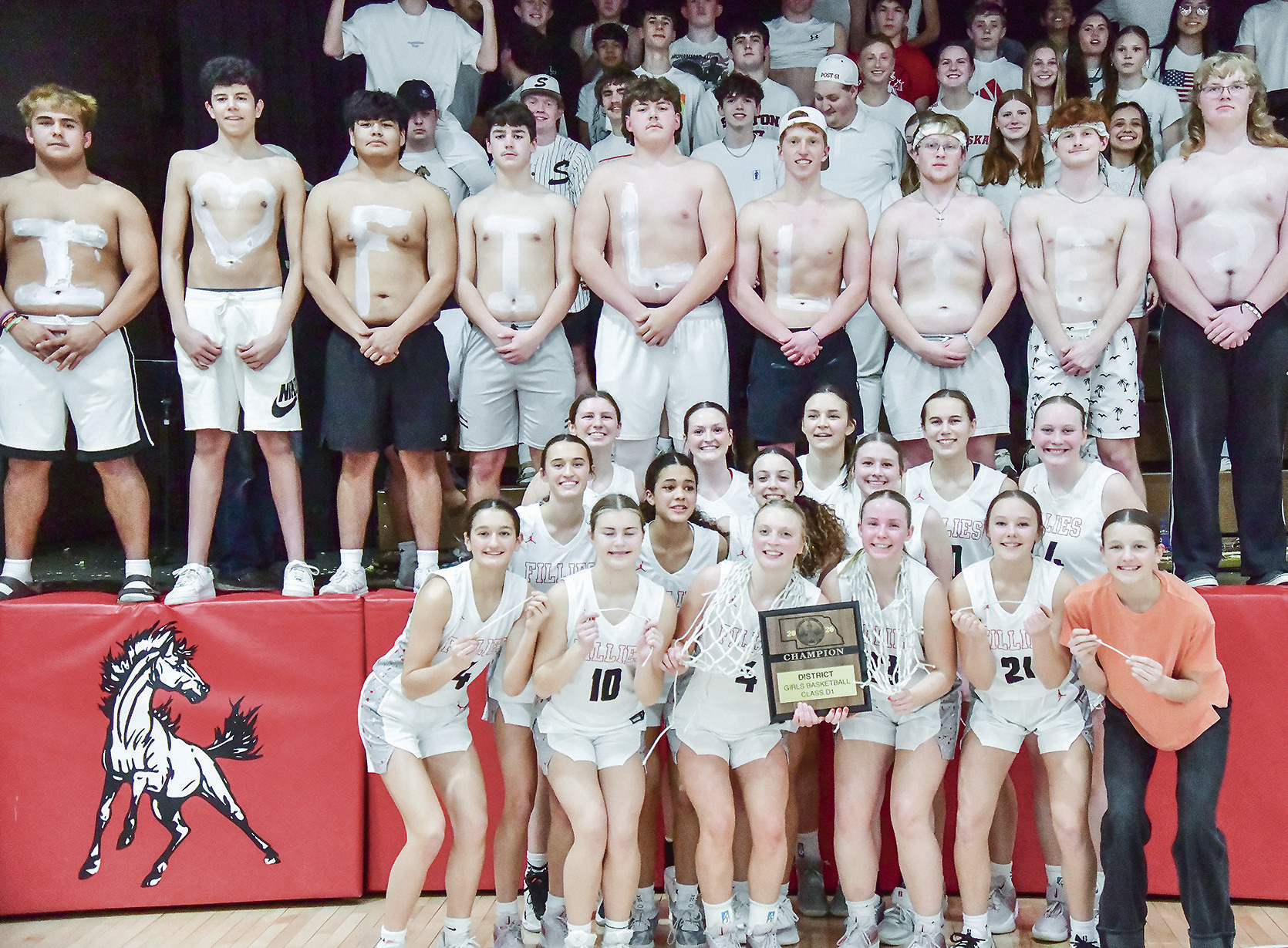 Sutton’s student body certainly stepped up to the challenge Friday, Feb. 27, while cheering on the Fillies during the D1-7 District final game in Sutton. The team posed with their student supporters following the win that advanced the Fillies to the Class D-1 state tournament this week in Lincoln. TORY DUNCAN | CLAY COUNTY NEWS