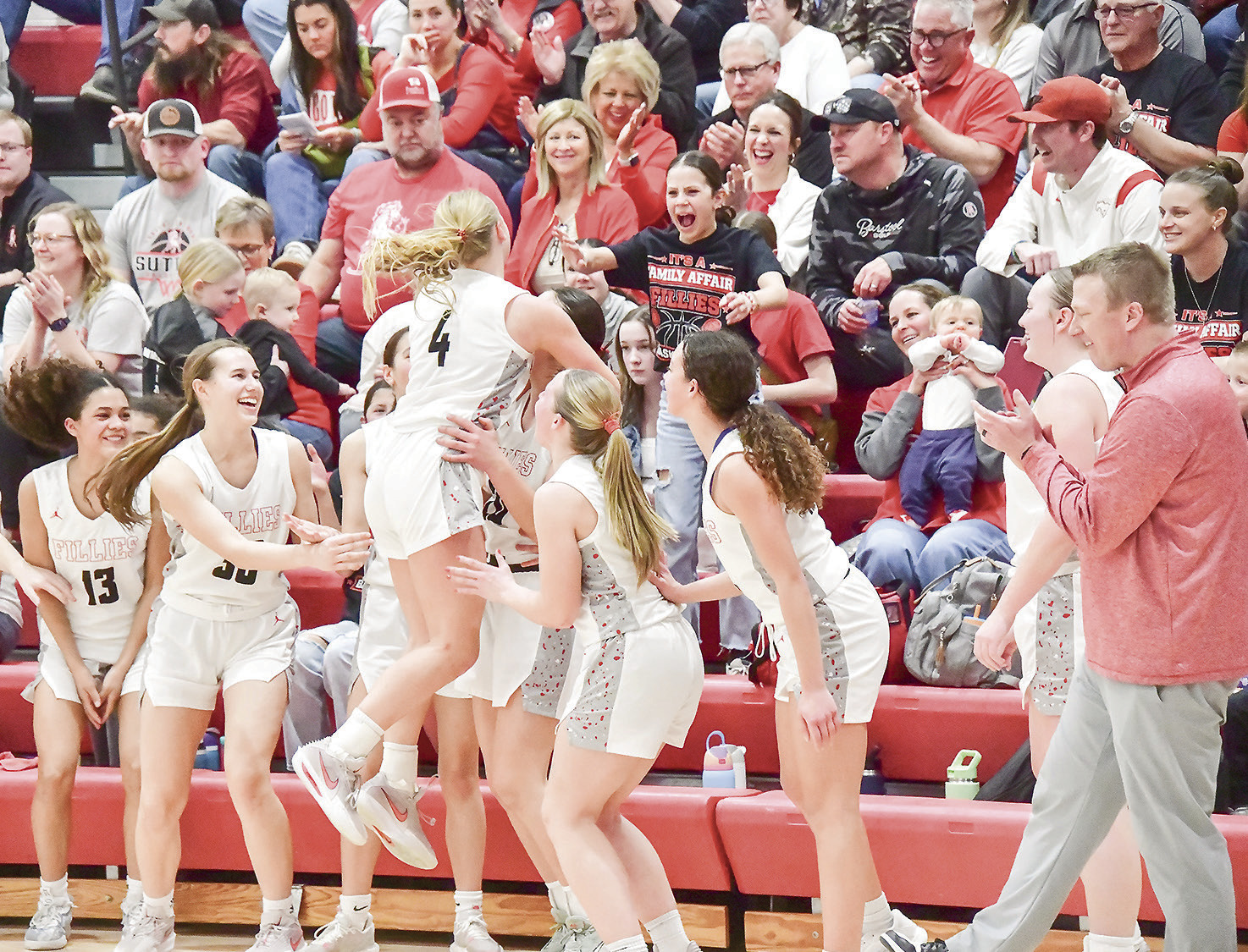 Senior Avery Smith dives into the arms of her teammates after sealing Sutton’s 49-23 D1-7 District final win over Tri County Friday, Feb. 27 in Sutton. The Fillies, owners of a 20-7 record, return to the state tournament this Thursday, taking on the Amherst Broncos at 10:45 a.m. at the Pinnacle Bank Arena in Lincoln. TORY DUNCAN | CLAY COUNTY NEWS