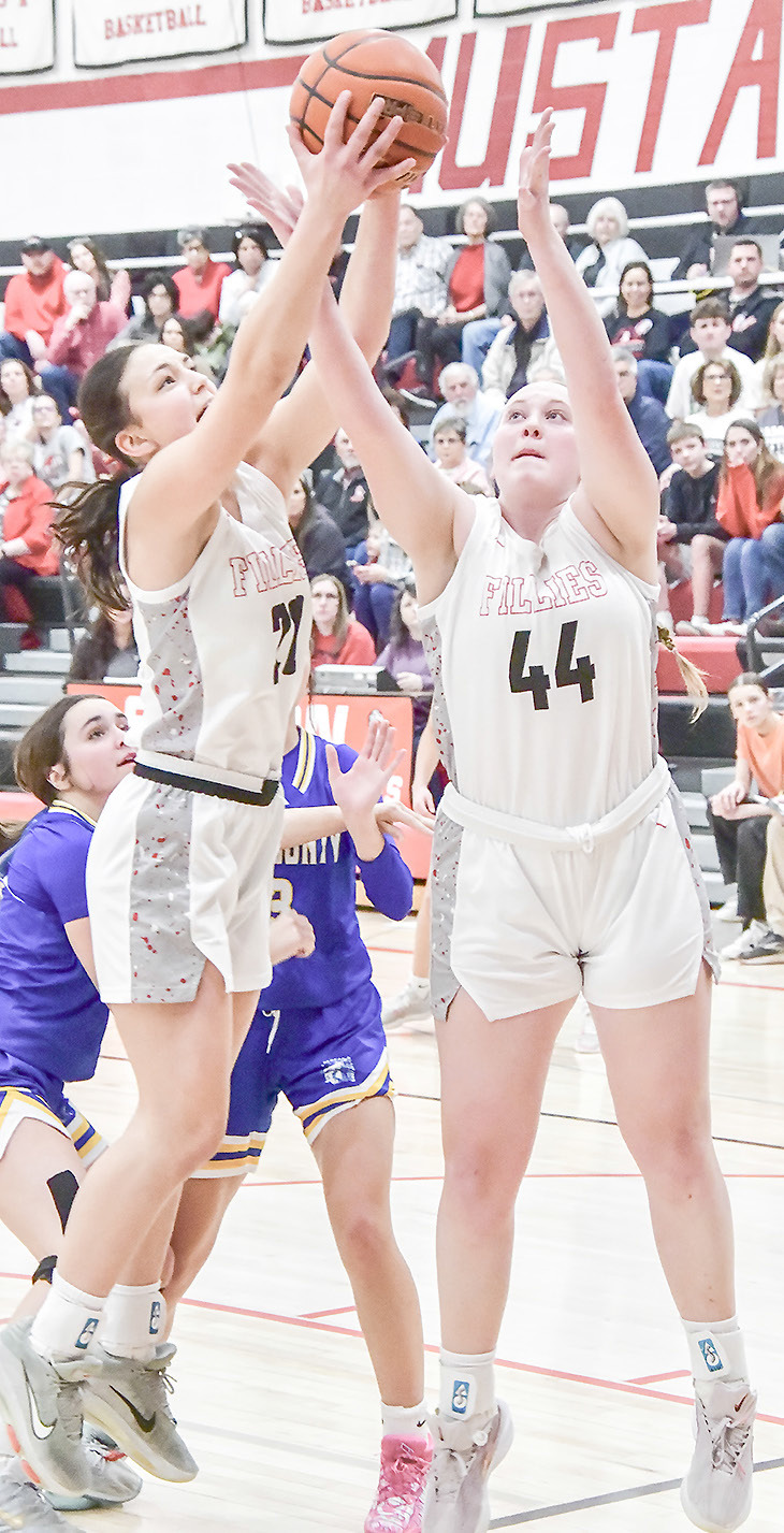Kamryn Steinhauer and Miranda Nuss both go after this rebound during Sutton’s 26-point win over Tri County in the D1-7 District Final game Friday, Feb. 27. The two combined for 12 rebounds in the win, with Nuss claiming seven and Steinhauer, five. TORY DUNCAN | CLAY COUNTY NEWS