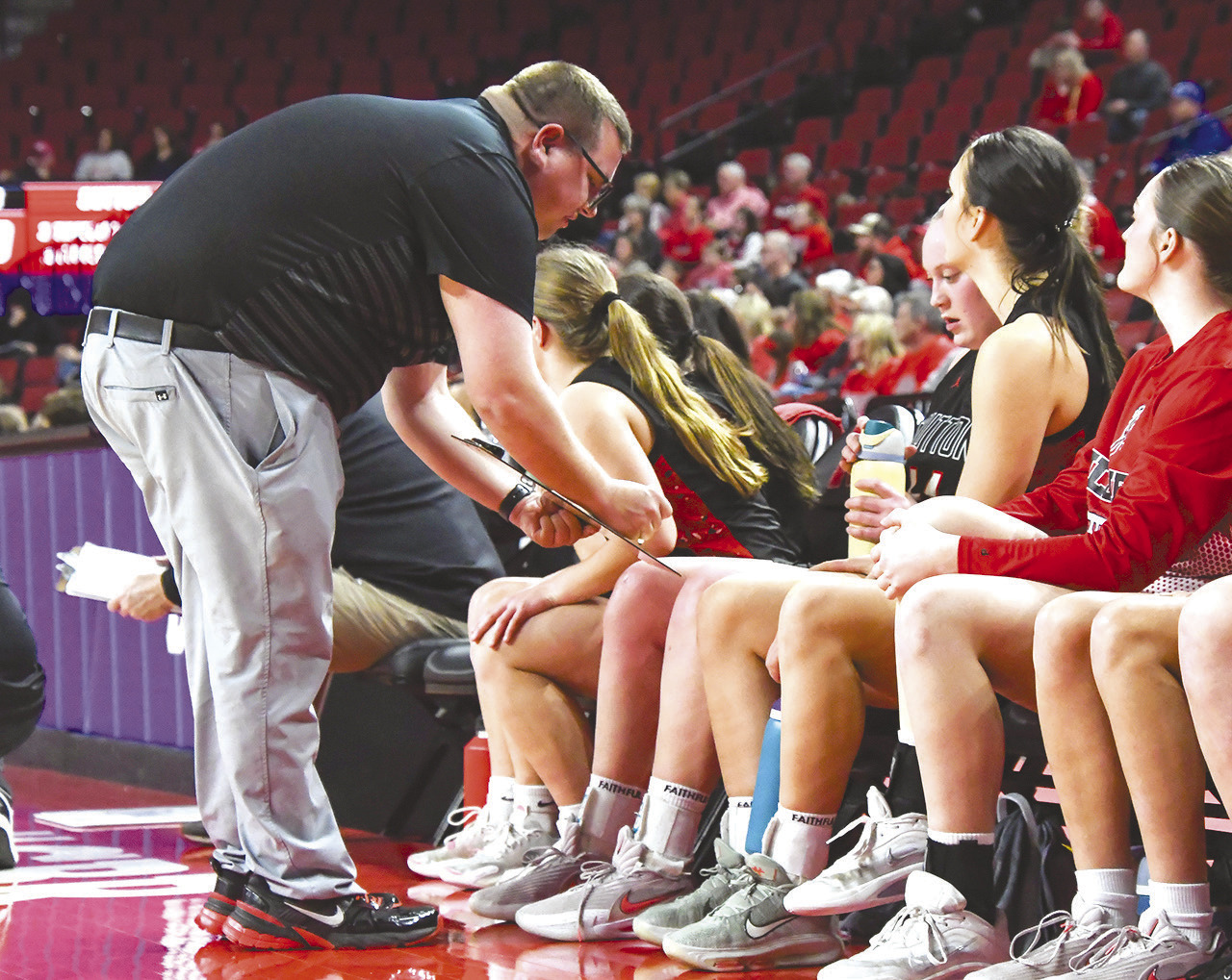 Assistant coach Dominic Schmidt talks with Miranda Nuss during the Fillies 15-point victory over Amherst Thursday, March 5. LILY GRIESS | CLAY COUNTY NEWS