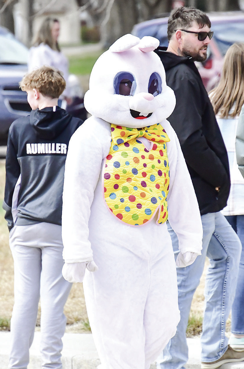 The Harvard Community Club, with the aid of the Della Keasling Memorial, hosted their annual Easter Egg Hunt Saturday, April 4 at the Harvard Rest Haven and the Harvard House Assisted Living center. Kids of all ages turned out for the event despite cool temperatures and brisk winds. Above, a large group of children take off like rockets to gather as much of the goodies and eggs that were available for the hunt, while at the left, the Easter bunny made an appearance during the hunt. Pre-kindergarten and kindergarten-age children cleared the lawn in front of the Harvard House Assisted Living Center. First and second-gradeage children covered the entire front yard of the Harvard Rest Haven, while third and fourth-grade-age children had the entire back yard of the Harvard Rest Haven for their annual adventure.
