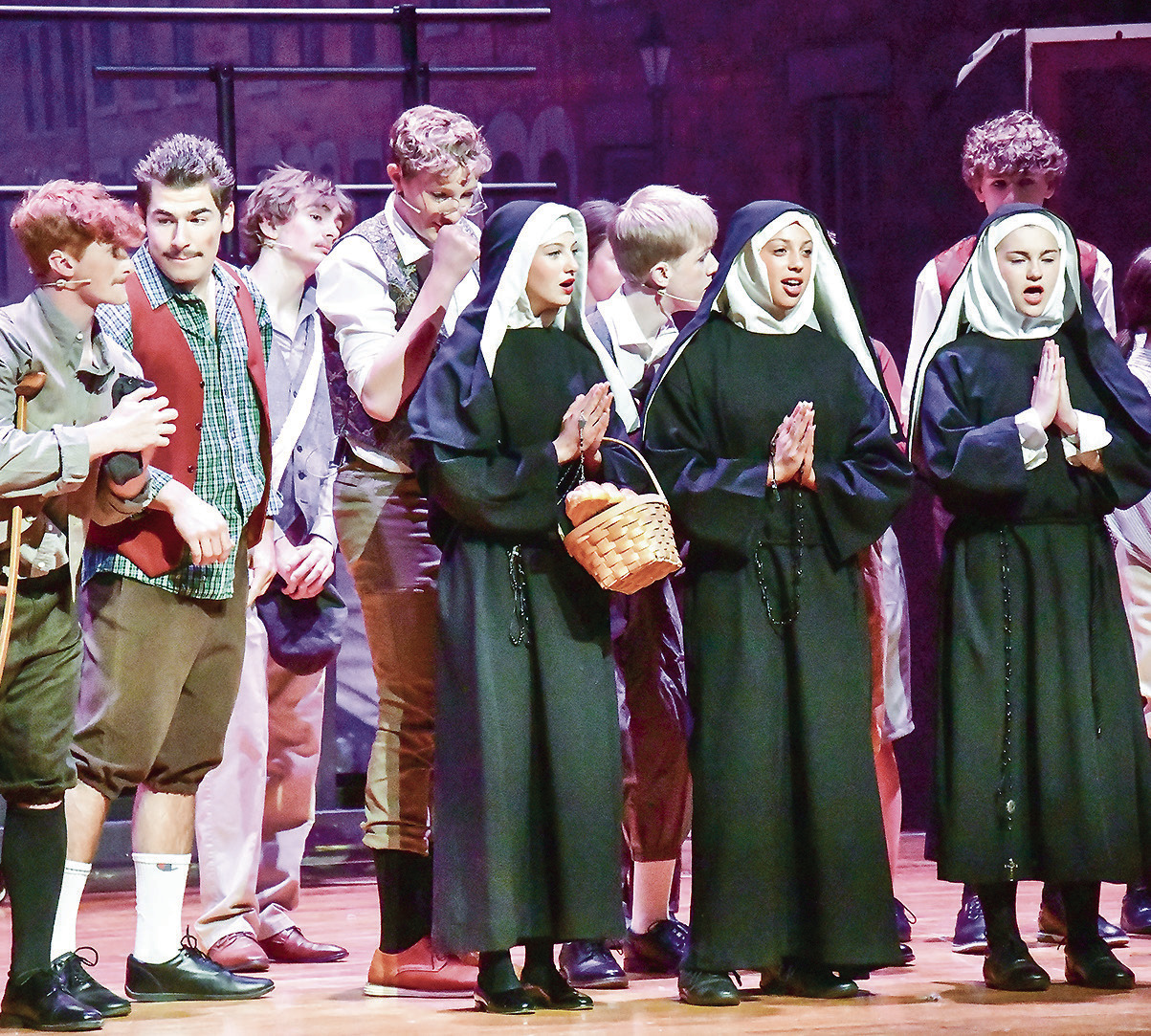BOTTOM RIGHT PHOTO: Three nuns, played by Elsa Andersen, Isabella Trejo, and Camden Mau, stand in for a scene during the first act of the musical.