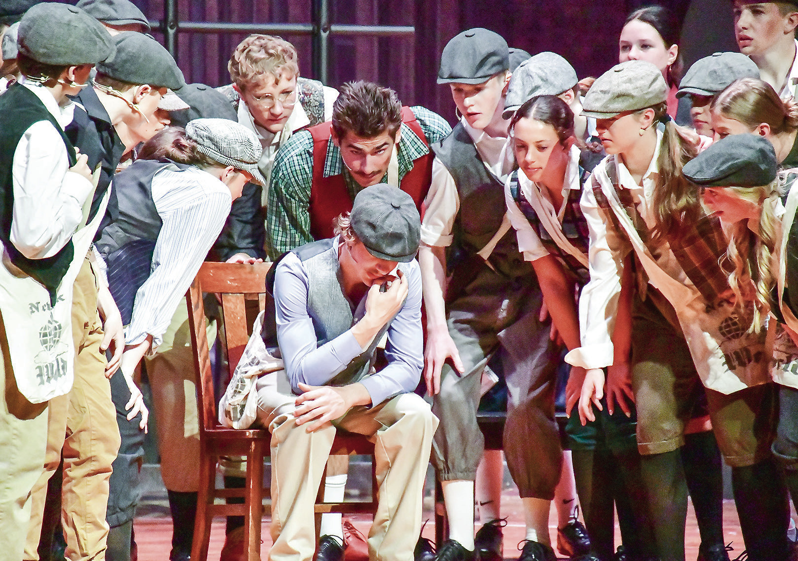 BOTTOM LEFT PHOTO: Keith Kliewer (Jack Kelly) contemplates with a large group of “newsies” during one of the scenes.